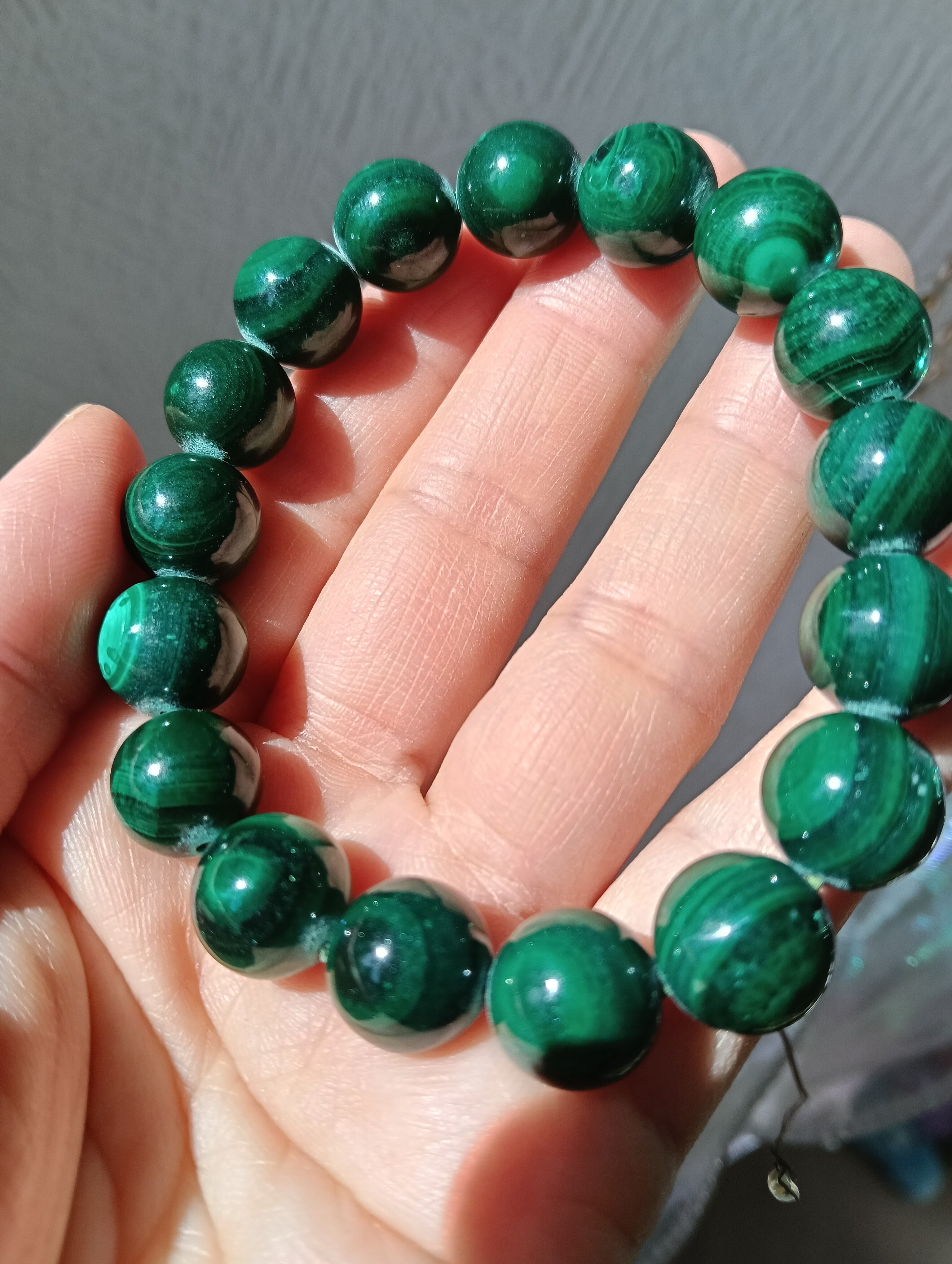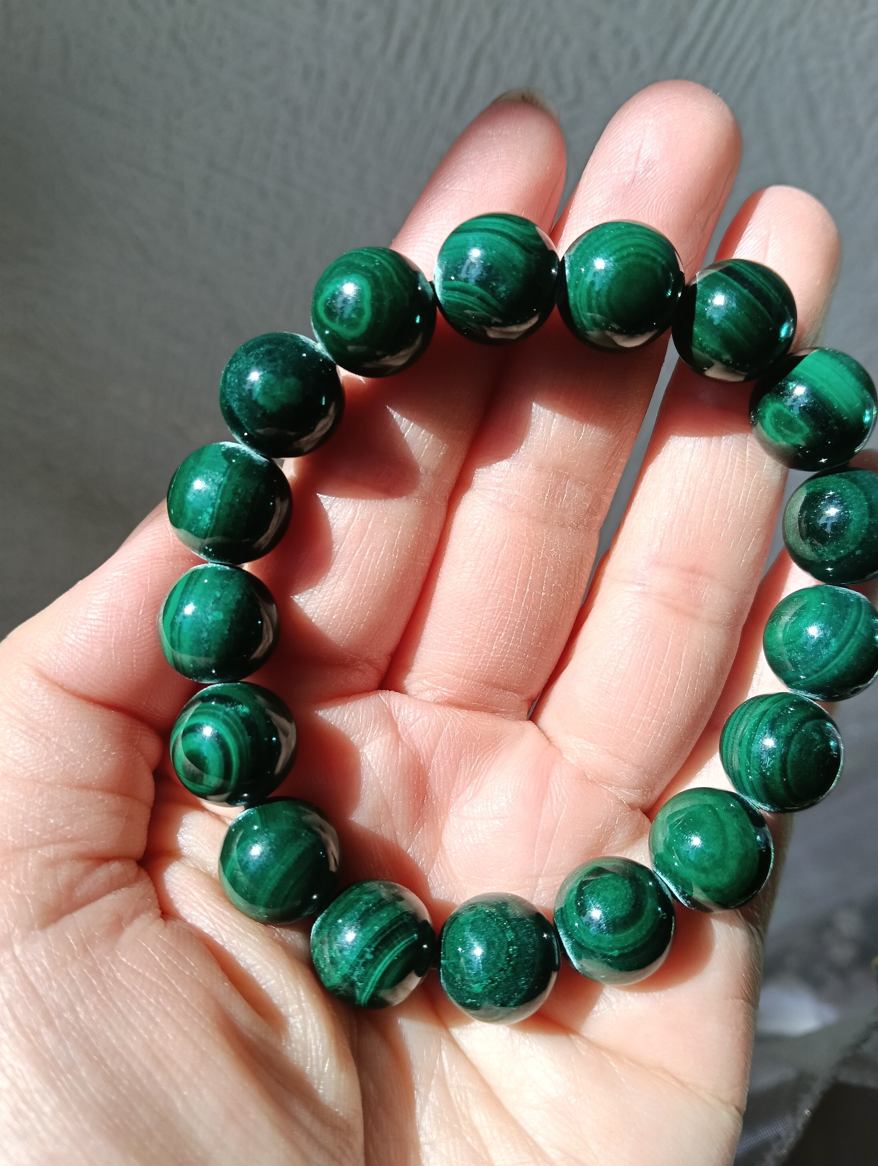 マラカイト独特の縞模様がハッキリと出ていて10ミリ玉使用のブレスレットは存在感と、パワフルなエネルギー盛りだくさん。